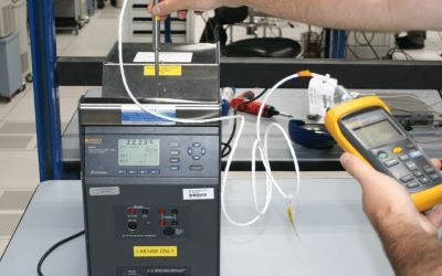 We utilize a number of different processes to perform temperature calibration on a wide range of instruments both in our lab and on the field. Digital recorder and thermometer calibration takes place on a Fluke multi-process calibrator.